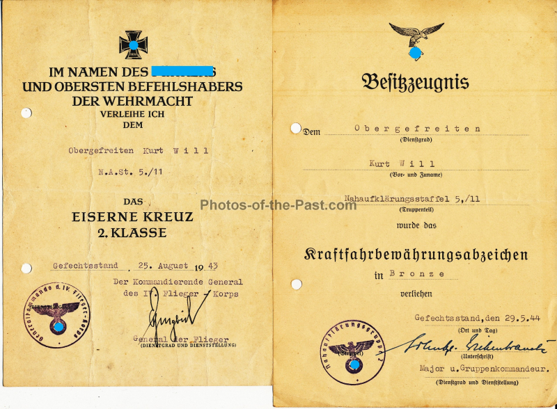 2 Dokumente EK II Verleihungsurkunde und Besitzzeugnis Kraftfahrbewährungsabzeichen in Bronze für einen Obergefreiten der Nahaufklärungsstaffel 11